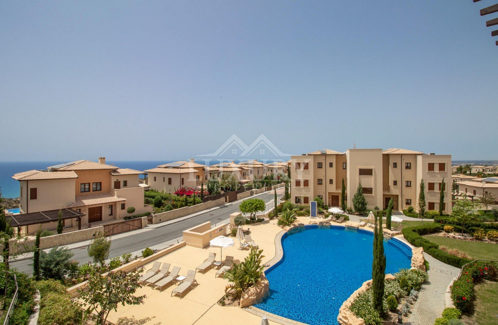 The apartment is located on the top floor, offering elevated views of the communal pool.