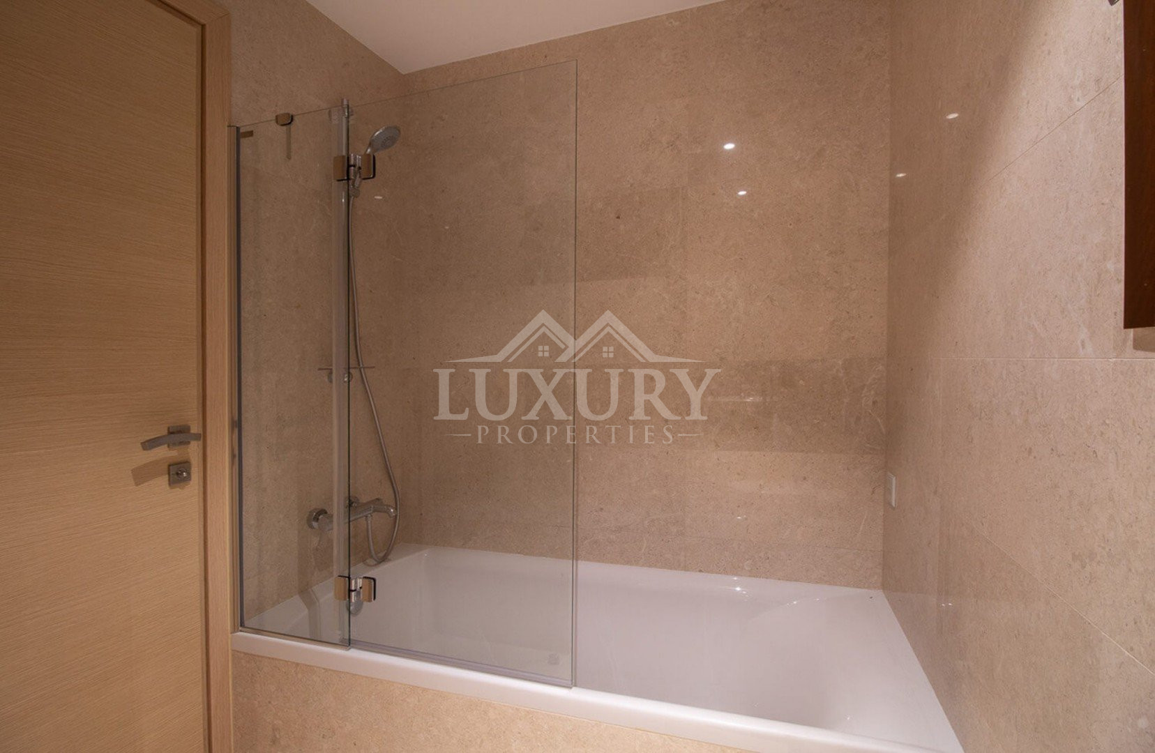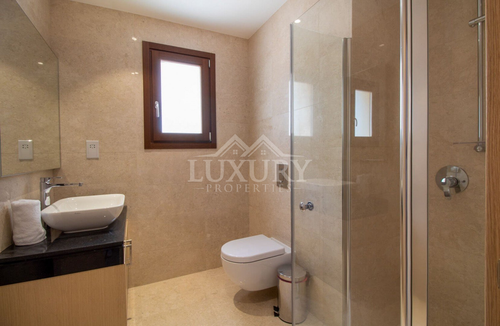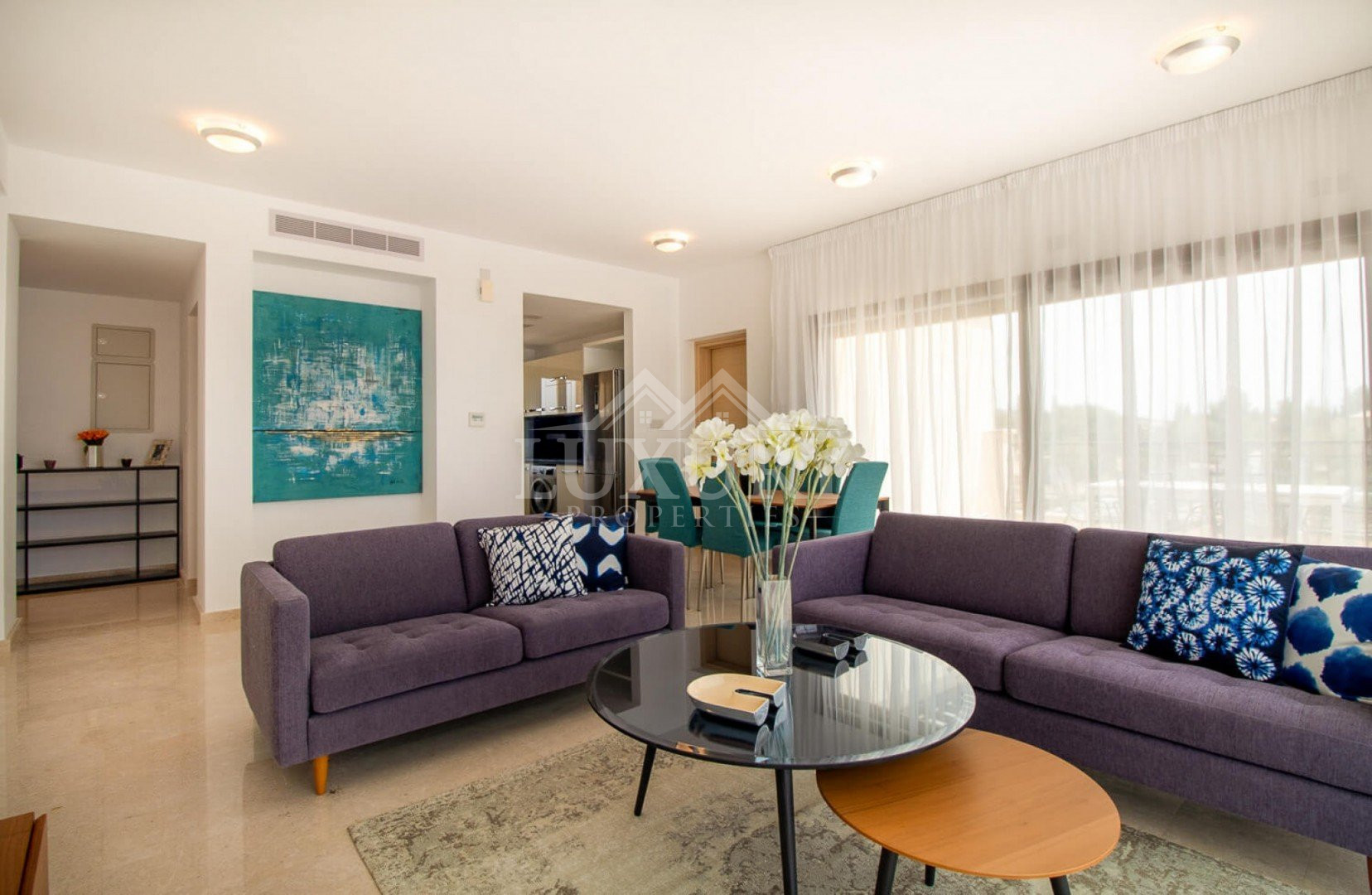 Crema marble flooring is featured in the living, dining, kitchen, and bathroom areas, while the bedrooms have parquet flooring.