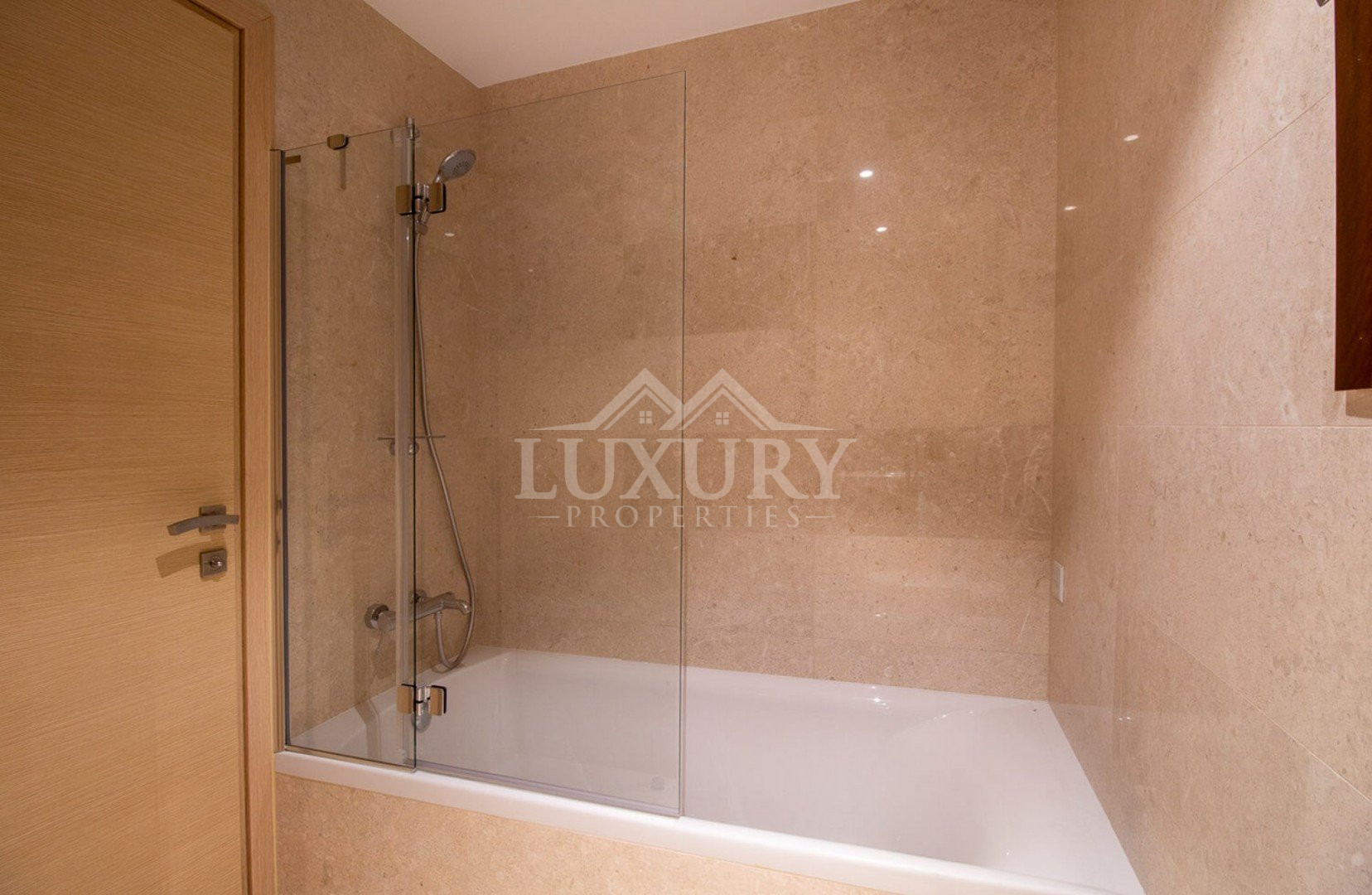The apartment boasts bright, spacious interiors and is fully equipped with modern amenities and brand-new fixtures. Crema marble flooring enhances the living, dining, kitchen, and bathroom areas, while the bedrooms feature warm parquet flooring for added comfort and style.