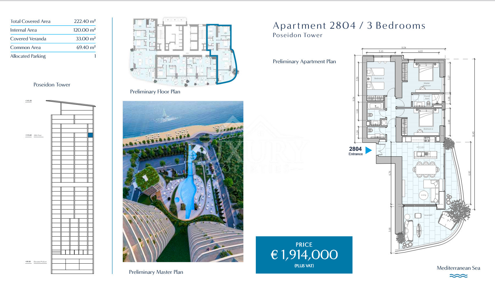 Generous layout for modern living: Total covered area 222.40 sqm (≈ 120 sqm internal, 33 sqm covered veranda, 69.40 sqm common areas) plus 1 covered, allocated parking. As one of the last available Limassol luxury properties in this landmark development, it presents a rare, time-sensitive investment in the Limassol Marina district.