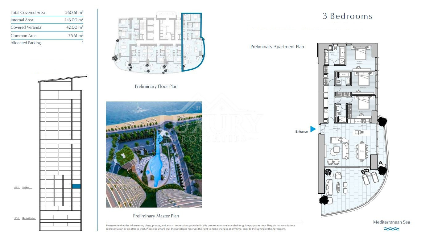Spanning a generous 260.16 sqm of total covered area, internal area 143sqm, covered veranda 42sqm and common area 75.16sqm the residence offers an open-plan living and dining layout bathed in natural light, flowing seamlessly onto a spacious private terrace overlooking the endless blue of the Mediterranean. It’s the perfect space for relaxing mornings, al fresco dinners, or sunset gatherings with loved ones.
