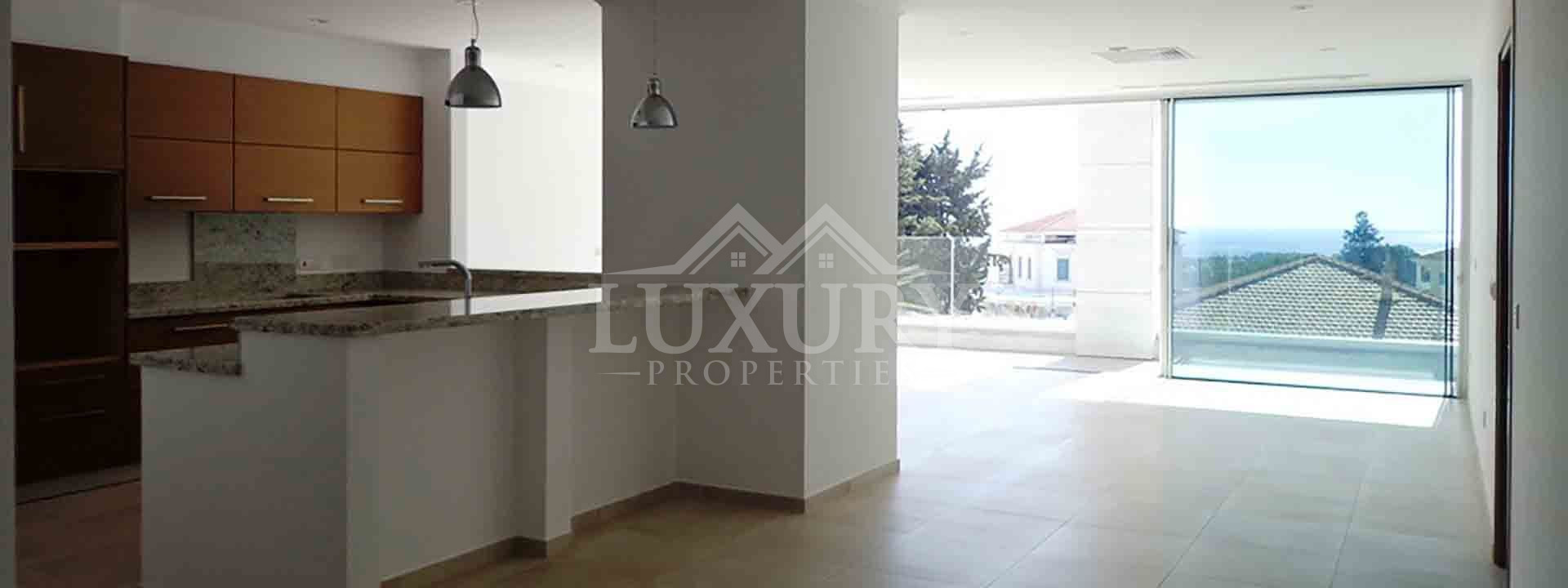 The apartment features an open-plan living area with a modern kitchen, two bathrooms and a guest WC.
