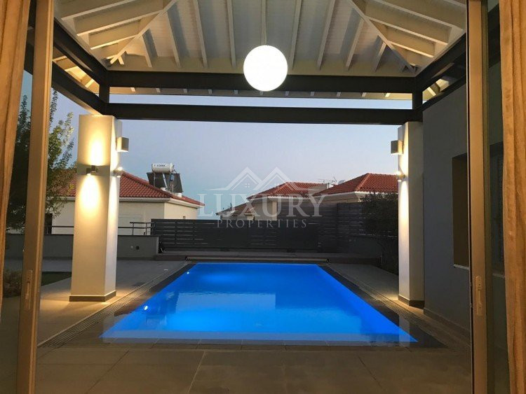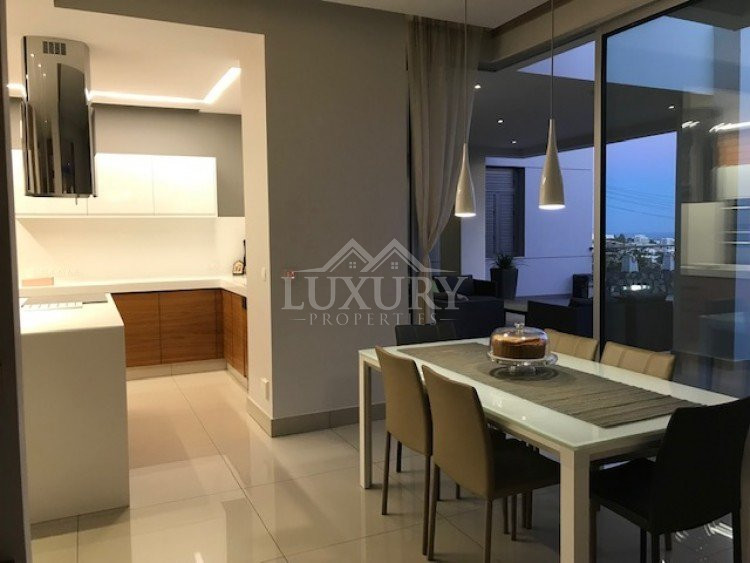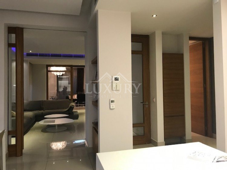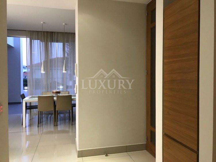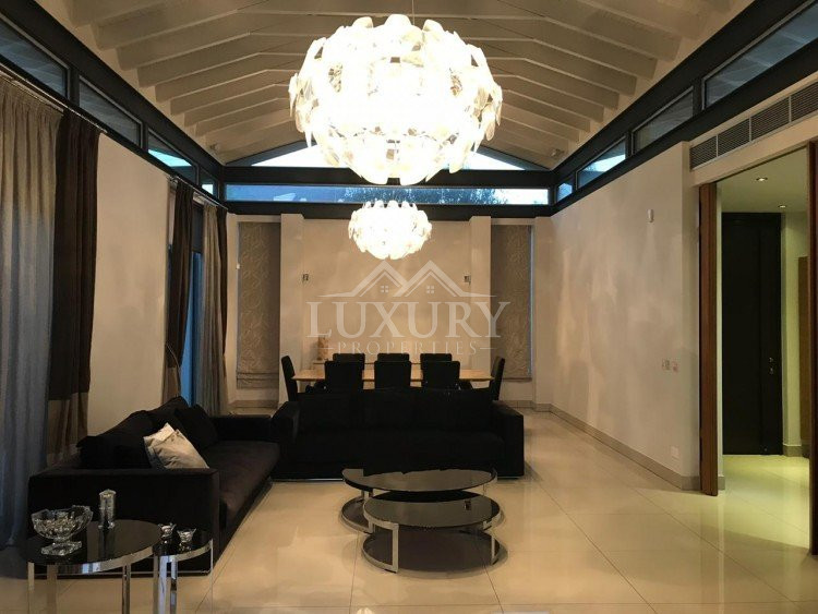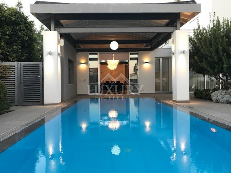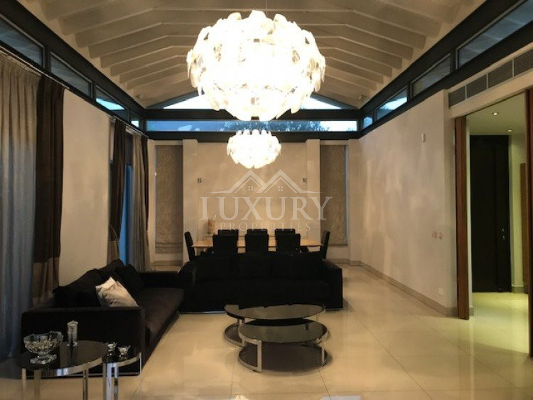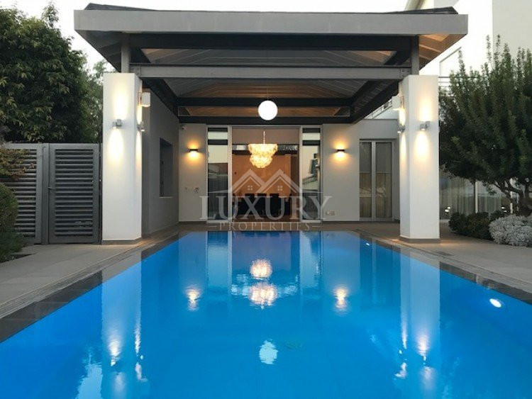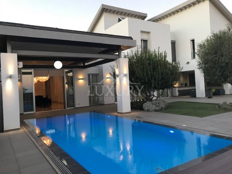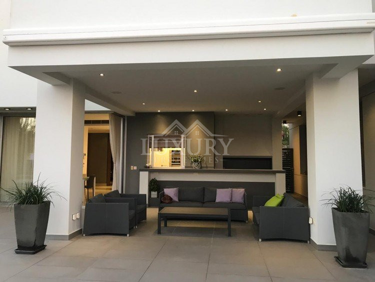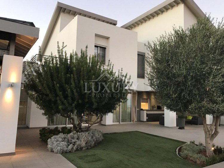 A luxury villa on three levels consisting of ground level, first floor and basement area. Situated on a corner large plot of 970m² south facing, securely gated around with landscaped gardens for privacy. Comfortable sitting/dining /tv area with separate kitchen breakfast/diner and utility area. Patio doors from all sides give an inside out feel. The rooms have sliding doors within the walls which can partition areas or give an open connecting feel. Ground level also has guest wc/shower, and 4th bedroom/office/ chill out room. Upper level has 3 bedrooms, master en suite with walk in wardrobe, main bathroom, All bedrooms have balconies. Further utility/laundry area. The house if fully smart house system, fully automated with Siemens automation system, Central sound system with 4 zones, full wifi system and smart phone connection to house. Security CCTV cameras and alarm system, glass break sensors. Daikin climate system throughout the property, moreover under floor heating diesel. All windows are dual glass for noise and heat insulation. The swimming pool is overflow with salt water, hydraulic cover for safety purposes, outside shower/wc/jet shower. All lighting and feature lighting is LED. Elevator to all floors, all wooden surfaces and doors, built in furniture units are of walnut wood. The modern kitchen and utilty area are made of Dupont materials blended with Corean surfaces. The stairs and bathrooms are of marble. Large veranda with outside sitting area with electric cover, built in BBQ, and external kitchen for outside entertainment. Lower ground level has maids quarter with bedroom shower/wc with separate entry. Double electric garage that can accommodate 3 cars, large storage areas.