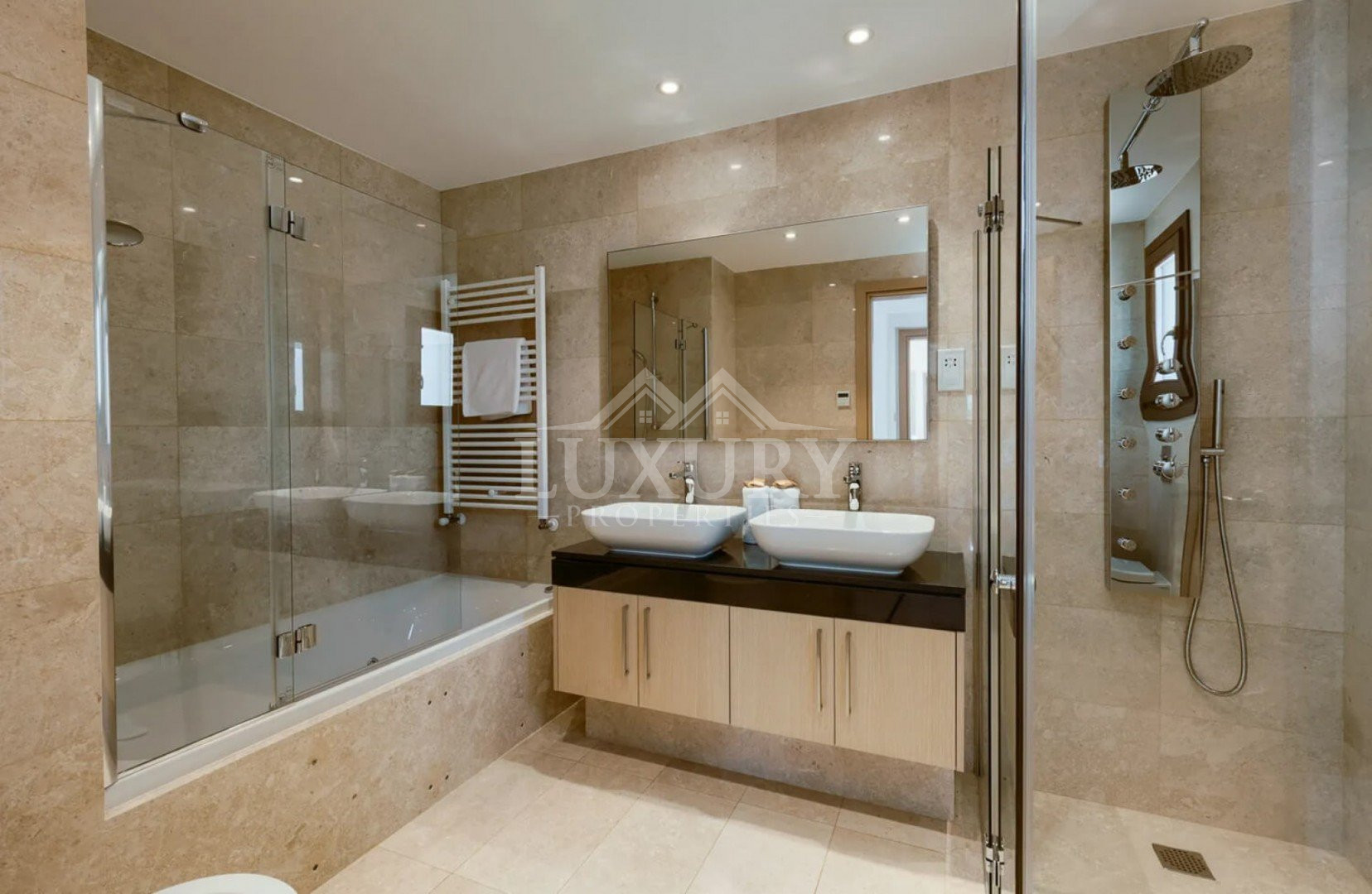 French doors open out to the large balcony from where one can take in the panoramic views, and an en-suite bathroom which is fully tiled in granite offers twin washbasins, WC, bath and separate shower.