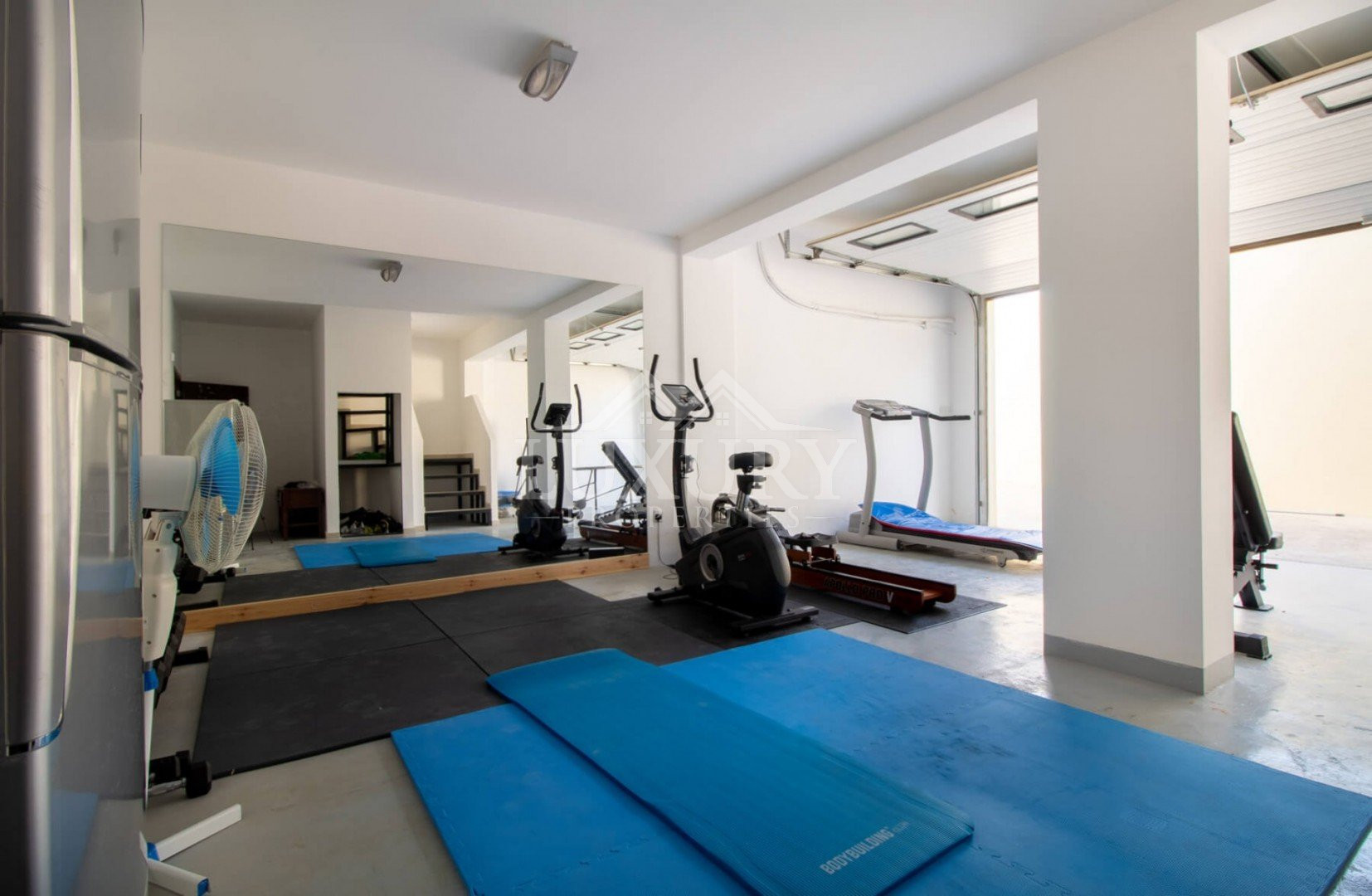 Yes, the lower level includes a gym with equipment, a bathroom, and a sauna.