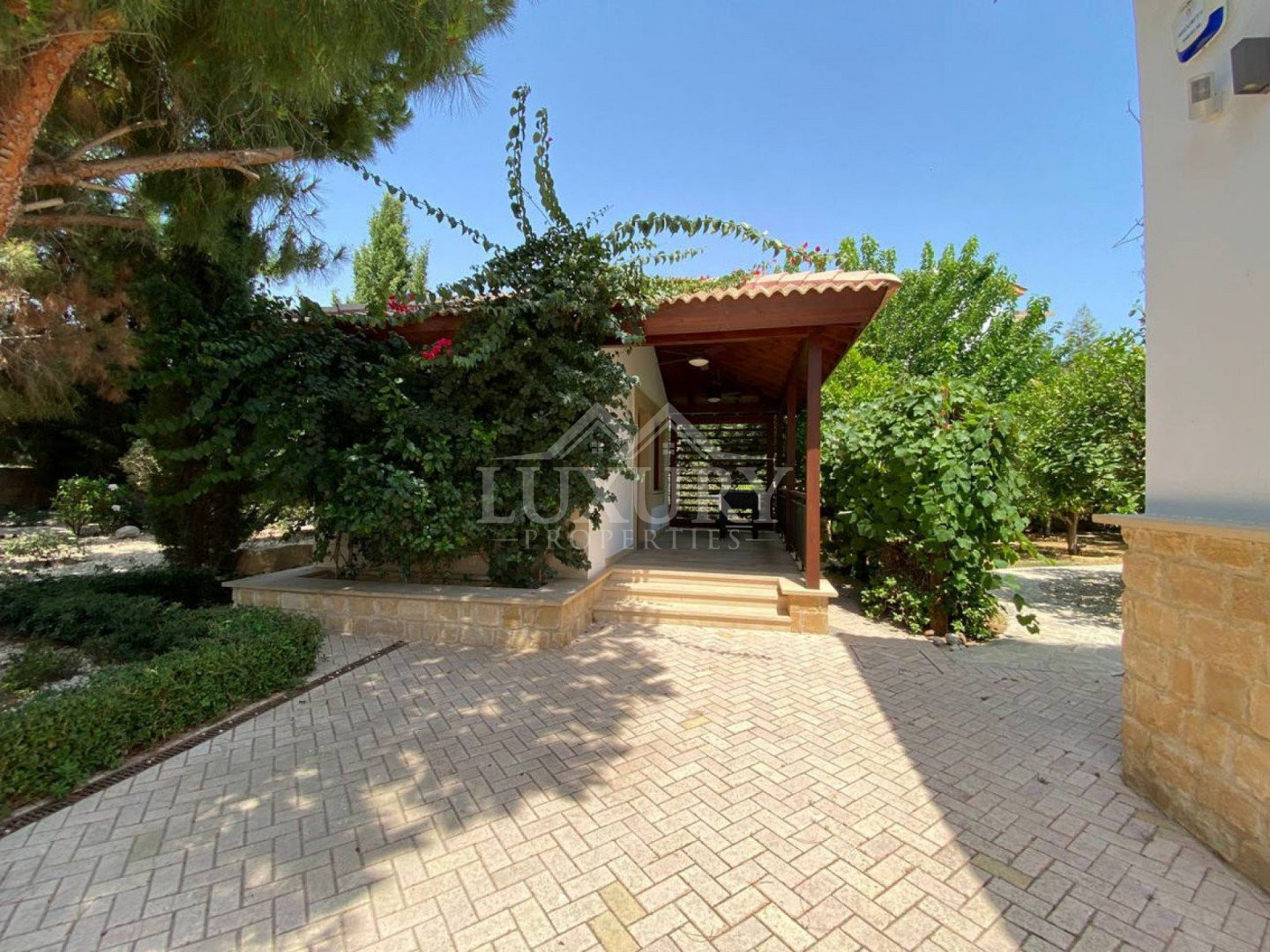 Stepping outside through the elegant French doors, you are greeted by expansive outdoor spaces designed for relaxation and entertaining. The landscaped garden blends traditional Cypriot elements with mature greenery and countless fruit trees. A very large overflow swimming pool, extensive terraces, and a spacious covered BBQ area make this villa perfect for gatherings and outdoor living.