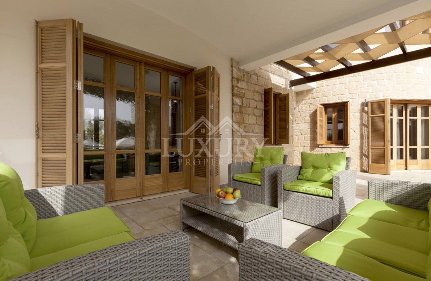 The patio area nests in fragrant shrubs, plants, and various kinds of native Cypriot flowers that also surround the large lawn.