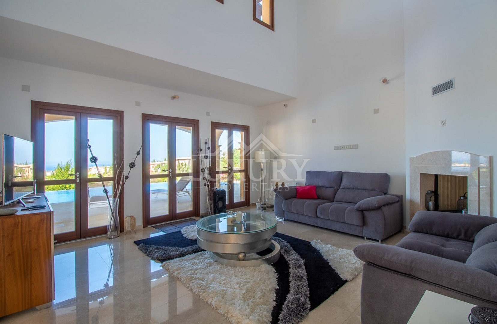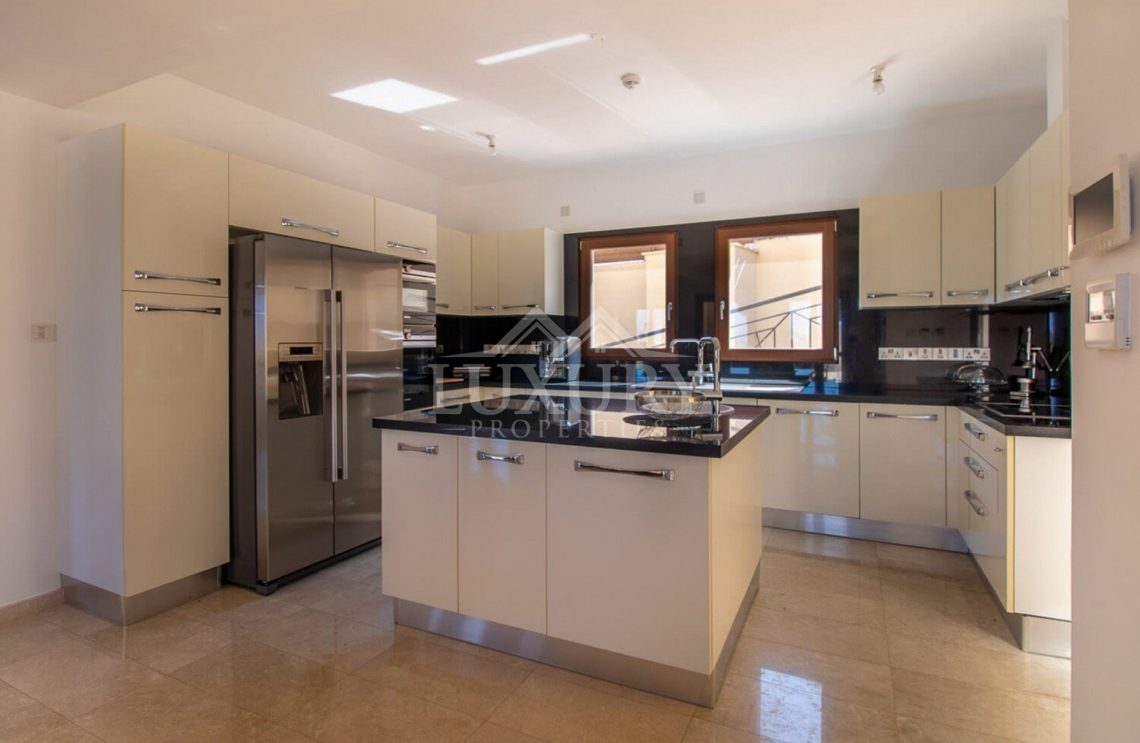 Inside, the villa is lavishly furnished with stylish décor, sumptuous fabrics, and rich color tones that create a true sense of opulence. The modern kitchen features sleek high-gloss cabinetry, premium worktops, and top-quality appliances including a large fridge-freezer, electric oven, hob, and dishwasher.