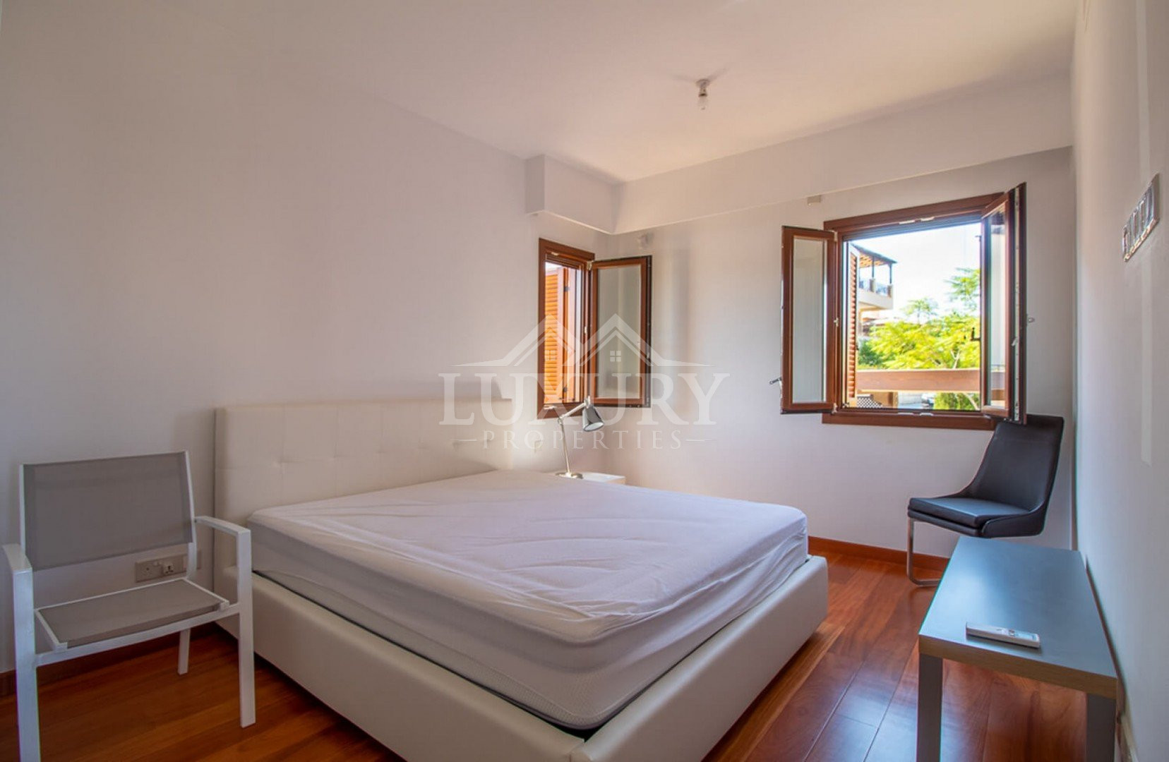 A marble staircase leads to the first floor, where three additional bedrooms enjoy wide-sweeping sea views. The master suite is exceptional, offering a luxurious king-size bed and French doors that open onto a private balcony overlooking the coastline. The elegant en-suite bathroom, fully tiled in granite, includes twin washbasins, a WC, a bath, and a separate shower.