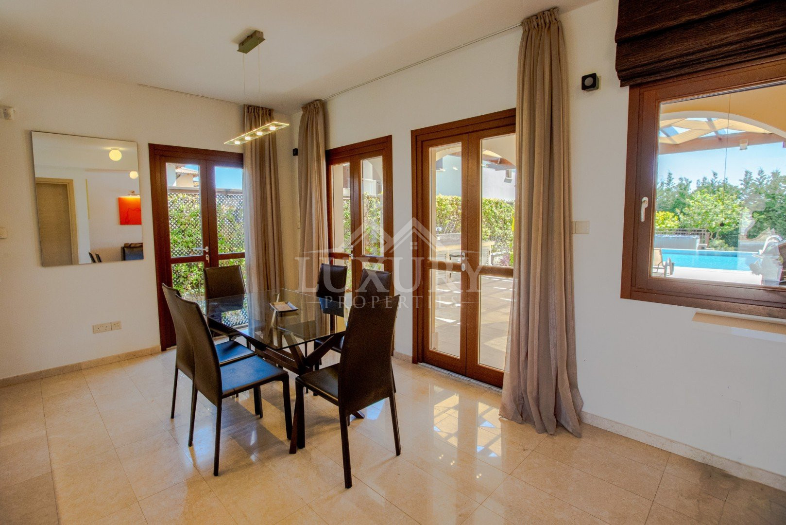 The interior of the villa is stylish and contemporary and offers light and airy open plan living areas. Attention to detail is evident everywhere with the highest quality Italian-style kitchen units, lavish marble bathrooms and marble or parquet flooring throughout. The impressive entrance opens into the spacious open plan living/dining area which features sets of French doors opening out onto the pool terrace. The lounge is beautifully finished with a plush sofa and armchair, large flat-screen TV and delightfully quirky accessories such as the designer coffee table and contrasting wall art. The adjacent dining area with modern dining table and chairs is separated from the kitchen by a handy sideboard. The kitchen is fitted with stylish high-gloss units including electric oven and hob, integrated dishwasher, washing machine and microwave. The ground floor also has a conveniently located cloakroom.