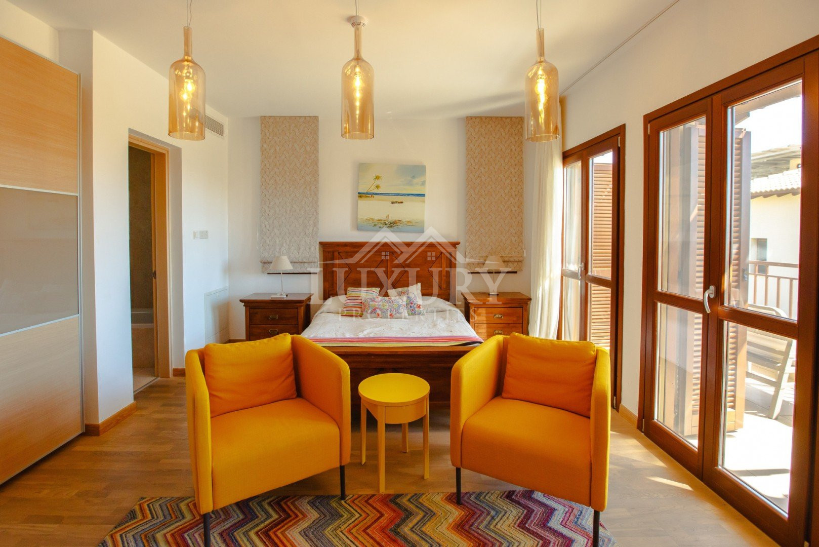 Upstairs, the spacious bedrooms are beautifully fitted with parquet floor and features attractive drapes and soft furnishings. Furnished with a king size/double beds, TV, dressers and matching side tables it offers a private balcony for each offering extensive sea views. The en-suite bathroom is fitted with twin wash basins in a marble vanity unit, and bath/shower combination.