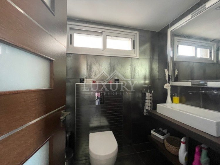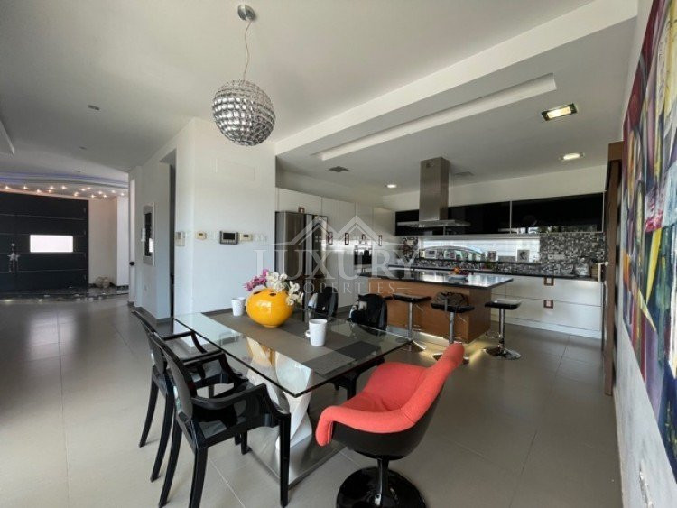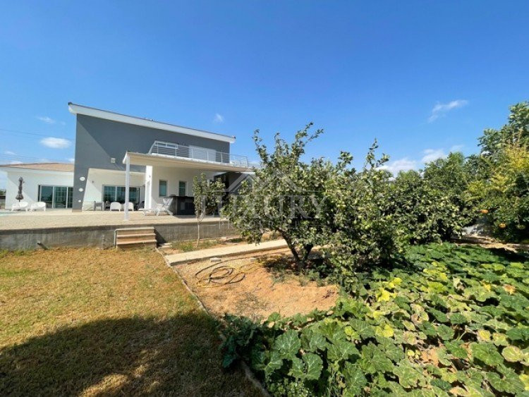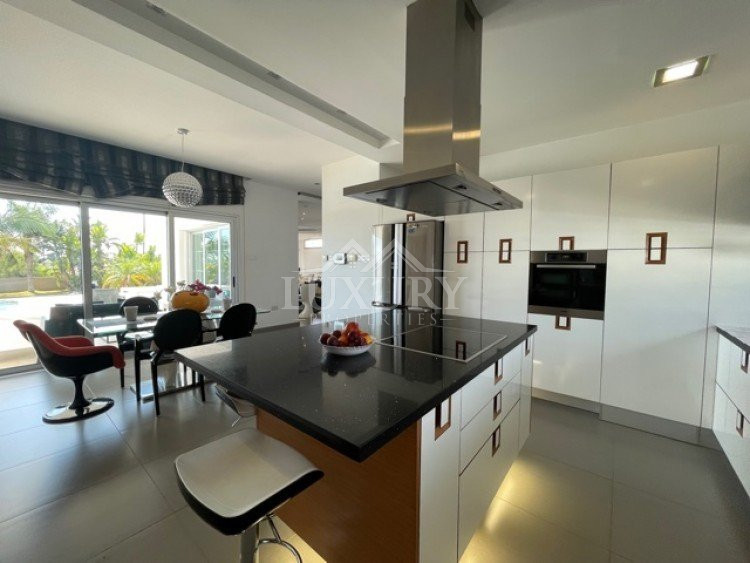 This beautiful villa is in a sought after location within easy access to all amenities, schools and highway.Modern design, bright with large windows overlooking the gardens and the swimming pool.Spacious sitting/lounge/dining areas, feature lighting, fully equipped kitchen with island bar and kitchenette. The ground level has guest wc, ground level bedroom en suite. All areas of the ground level access the gardens and outside sitting areas.The upper level has 3 large bedrooms, master en suite, main bathroom, utility area and extra storage areas, large verandas off the two bedrooms offering views of the surrounding areas, partial sea views.under floor heating, electric shutters, alarm system.