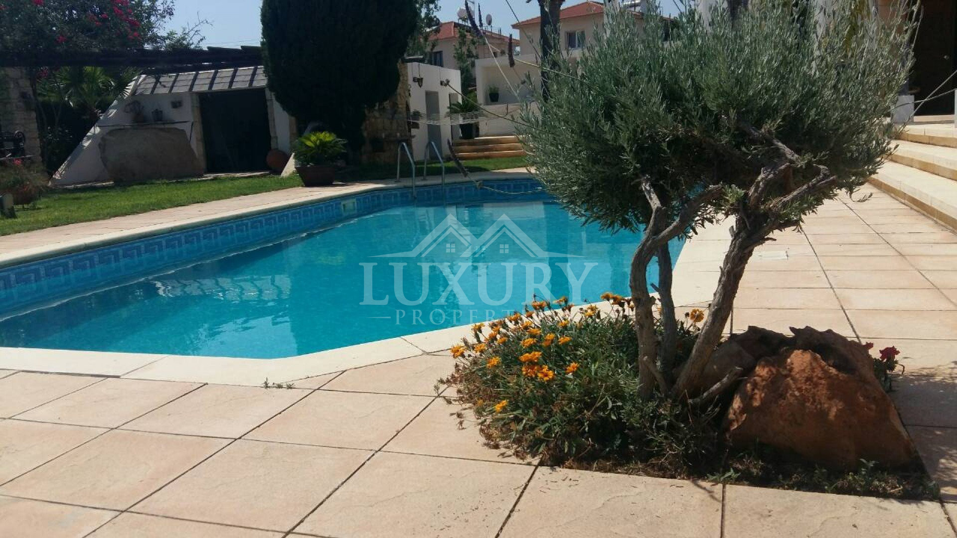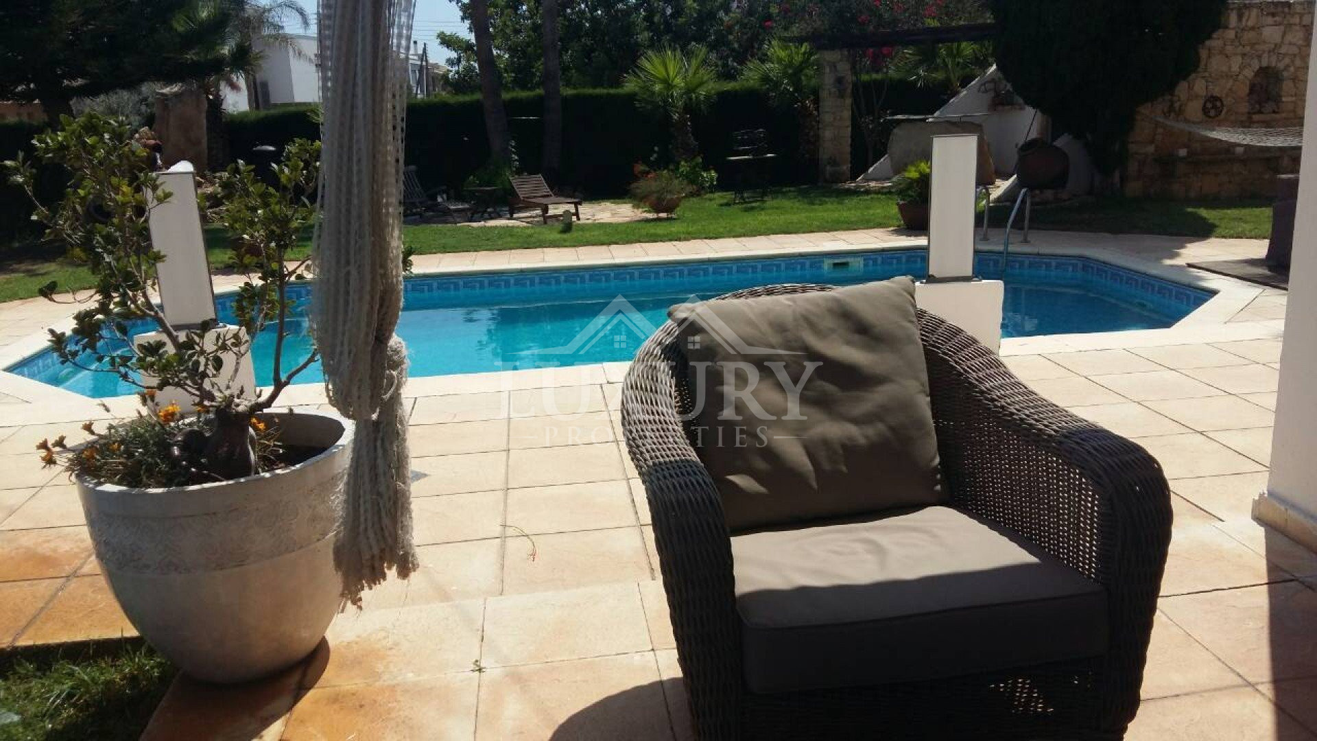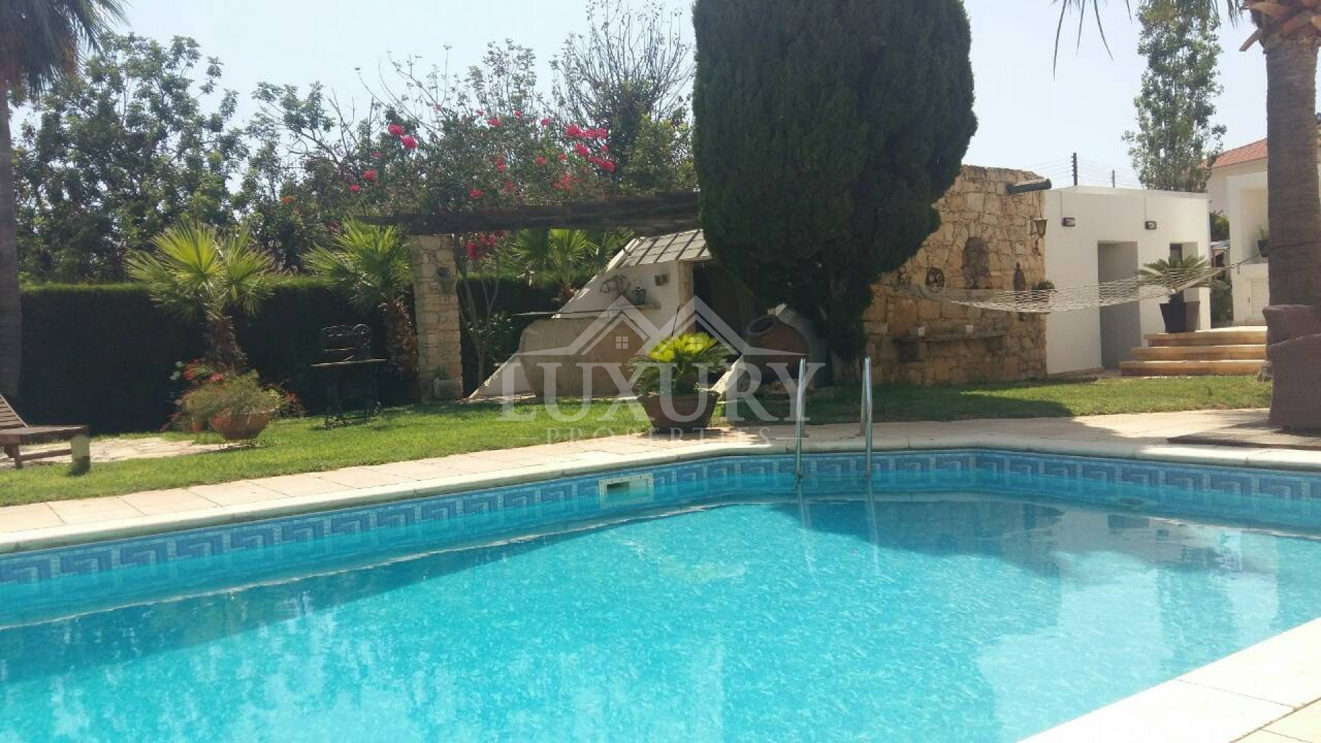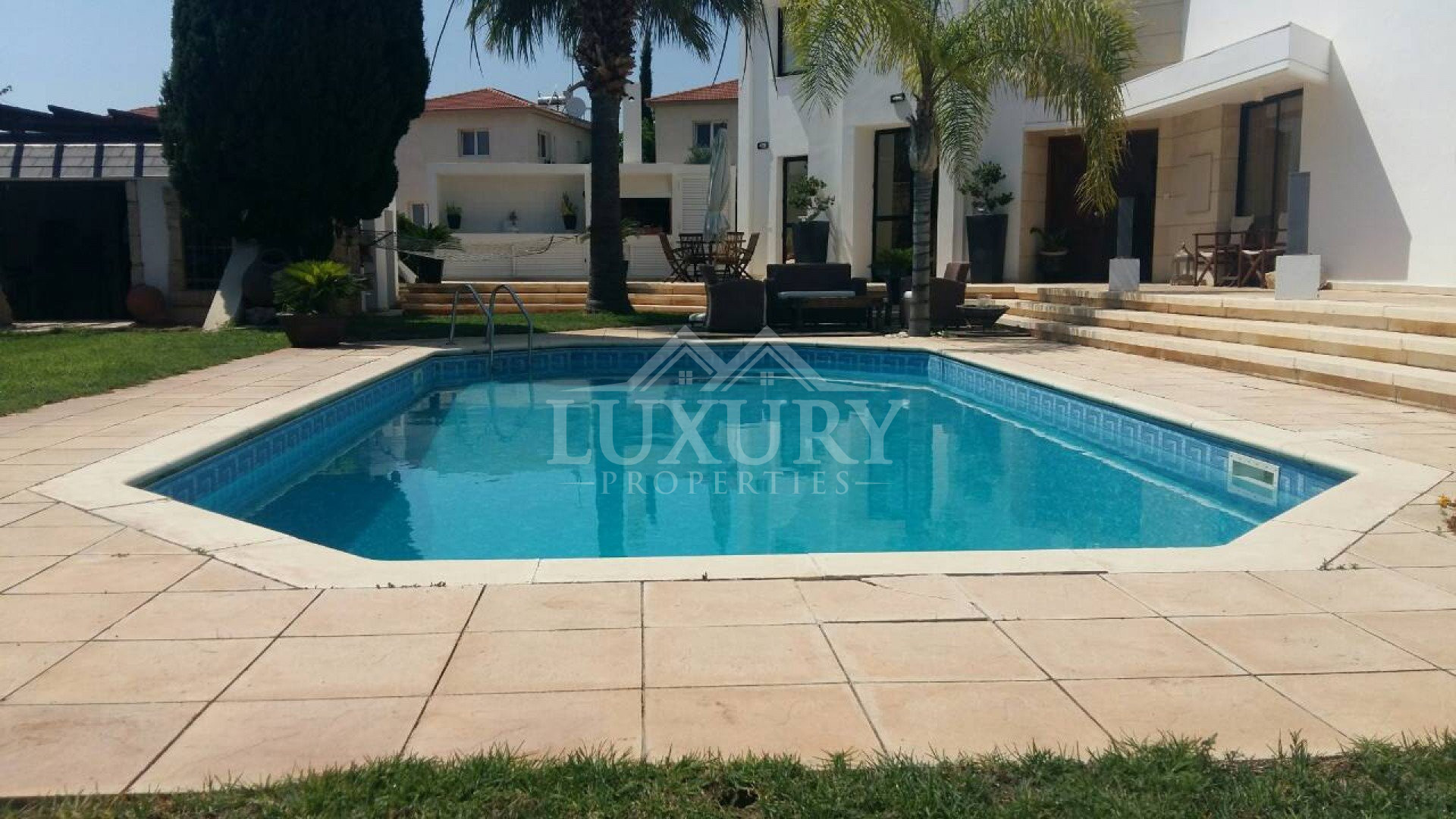 Lovely four bedroom villa in Ypsonas available for rent, built in two levels. It has internal covered area 480 square meters and the plot size 1800 square meters. In the ground floor there is an open plan kitchen with 3 living rooms,3 sitting rooms and 2 dining rooms, a bar and guest w/c. Also there two fire places and one utility room. On the first floor there are four bedrooms and one of them has en-suite bathroom, all of them with fitted wardrobes. There is also a family bathroom on the first floor. Outside of the building there is a nice big garden with trees and flowers, with automatic watering system and large parking space for four cars. Also there is a swimming pool and a changing room with shower and w/c.There is a maids-room separately from the house.The aluminium doors and windows are double glazed with security locks. It has storage room and solar water heater with pressure. Located in a quiet ,nice area surrounded by nice houses. Also it has private garage, security system and diesel central heating . It has easy access to the motorway.