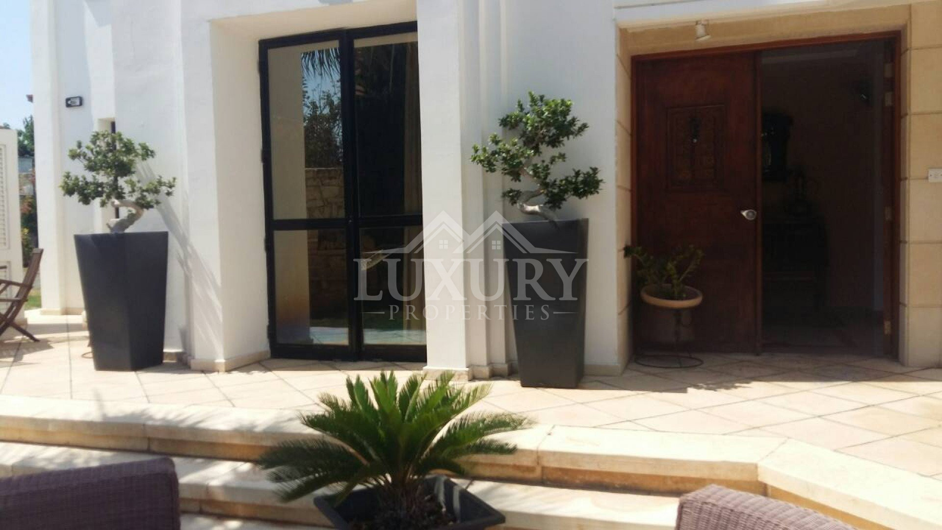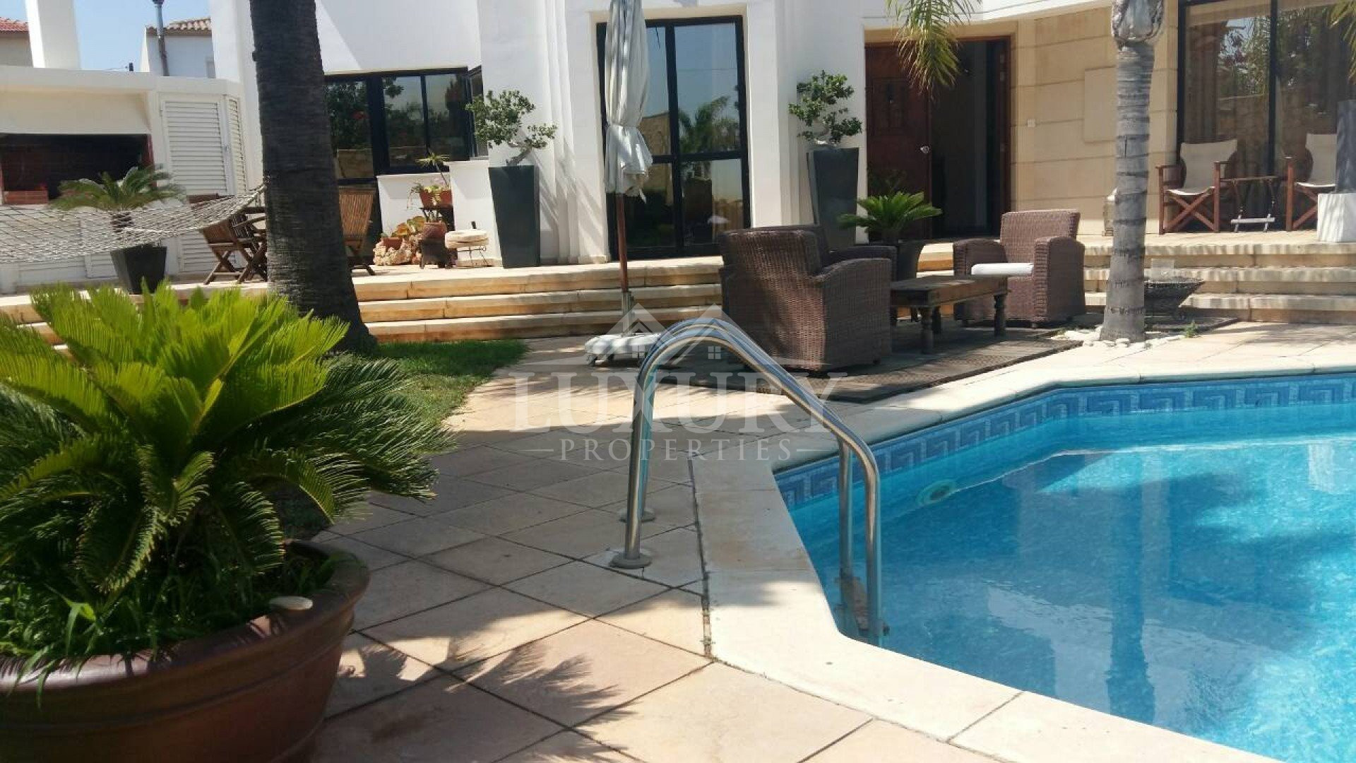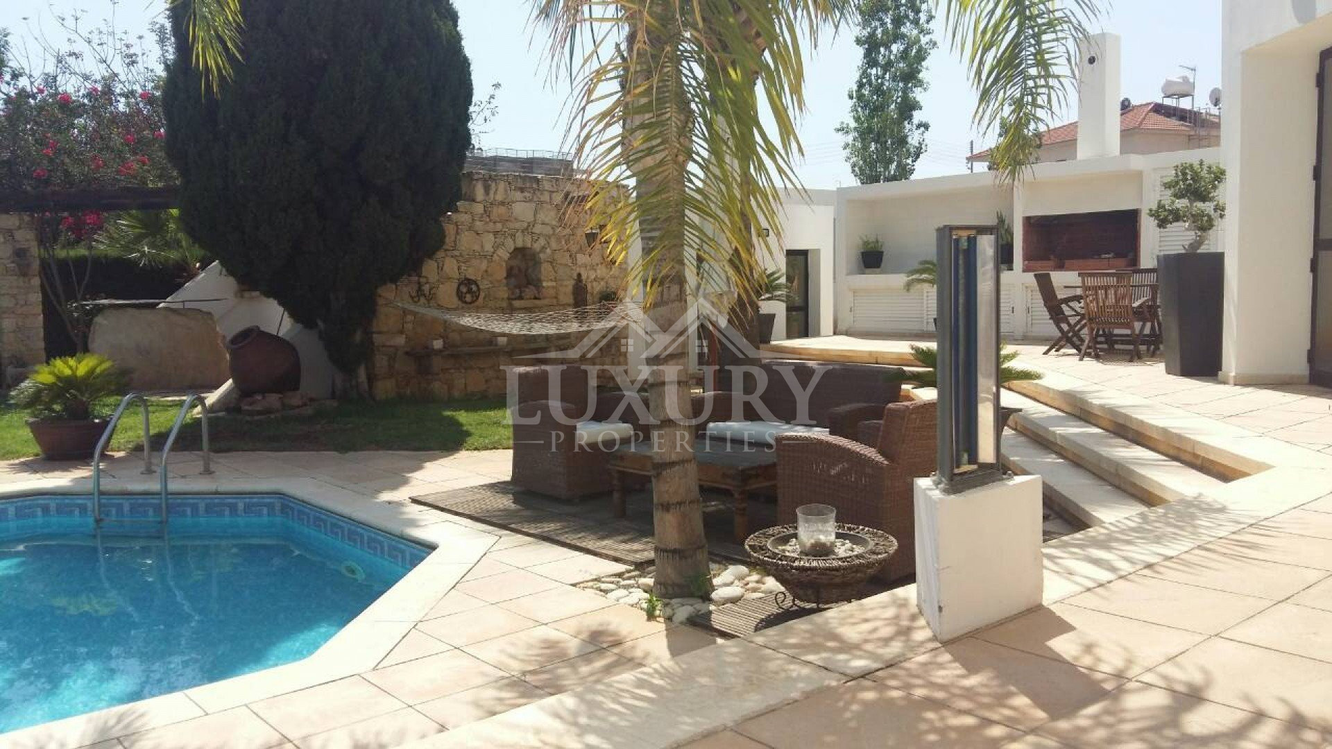 Lovely four bedroom villa in Ypsonas available for rent, built in two levels. It has internal covered area 480 square meters and the plot size 1800 square meters. In the ground floor there is an open plan kitchen with 3 living rooms,3 sitting rooms and 2 dining rooms, a bar and guest w/c. Also there two fire places and one utility room. On the first floor there are four bedrooms and one of them has en-suite bathroom, all of them with fitted wardrobes. There is also a family bathroom on the first floor. Outside of the building there is a nice big garden with trees and flowers, with automatic watering system and large parking space for four cars. Also there is a swimming pool and a changing room with shower and w/c.There is a maids-room separately from the house.The aluminium doors and windows are double glazed with security locks. It has storage room and solar water heater with pressure. Located in a quiet ,nice area surrounded by nice houses. Also it has private garage, security system and diesel central heating . It has easy access to the motorway.