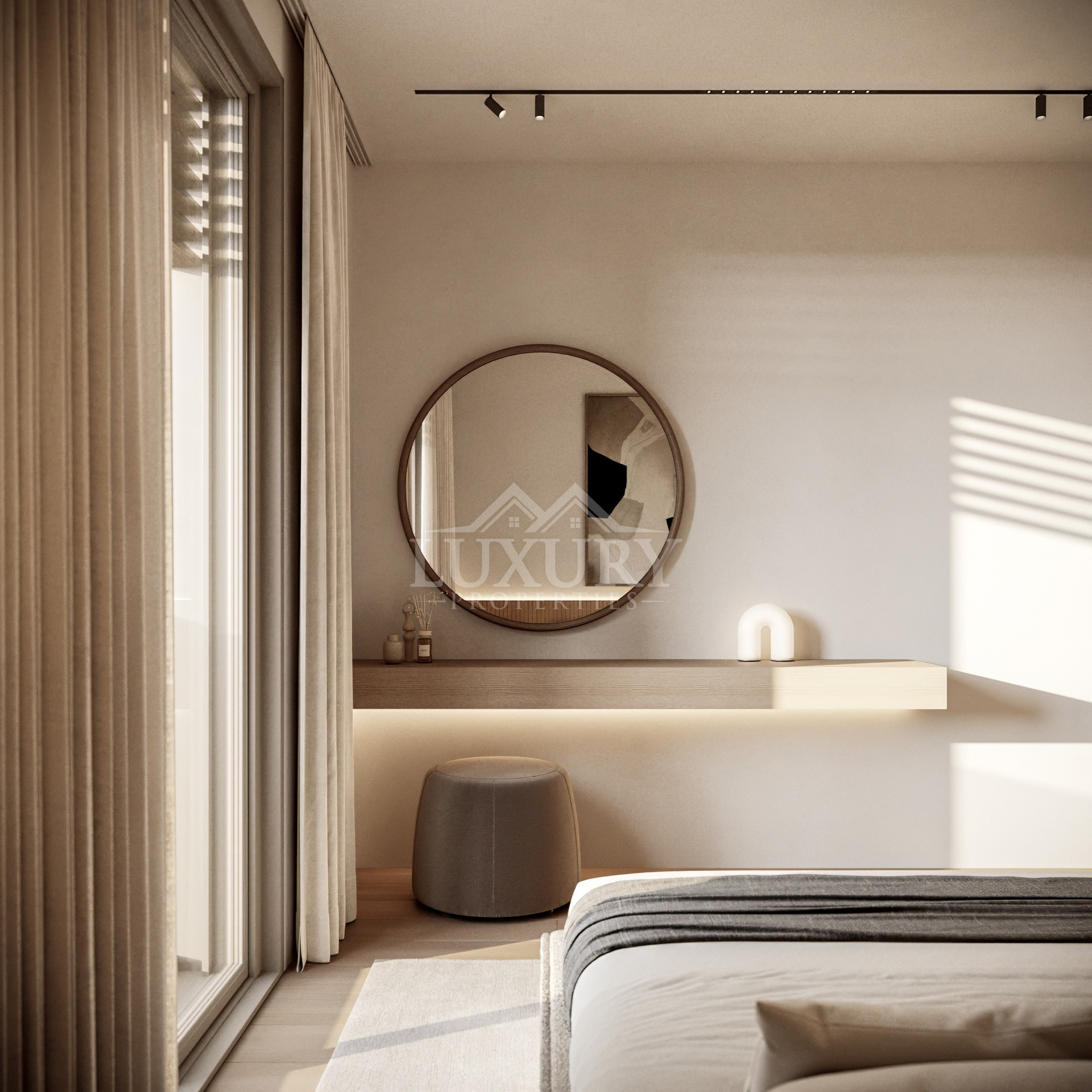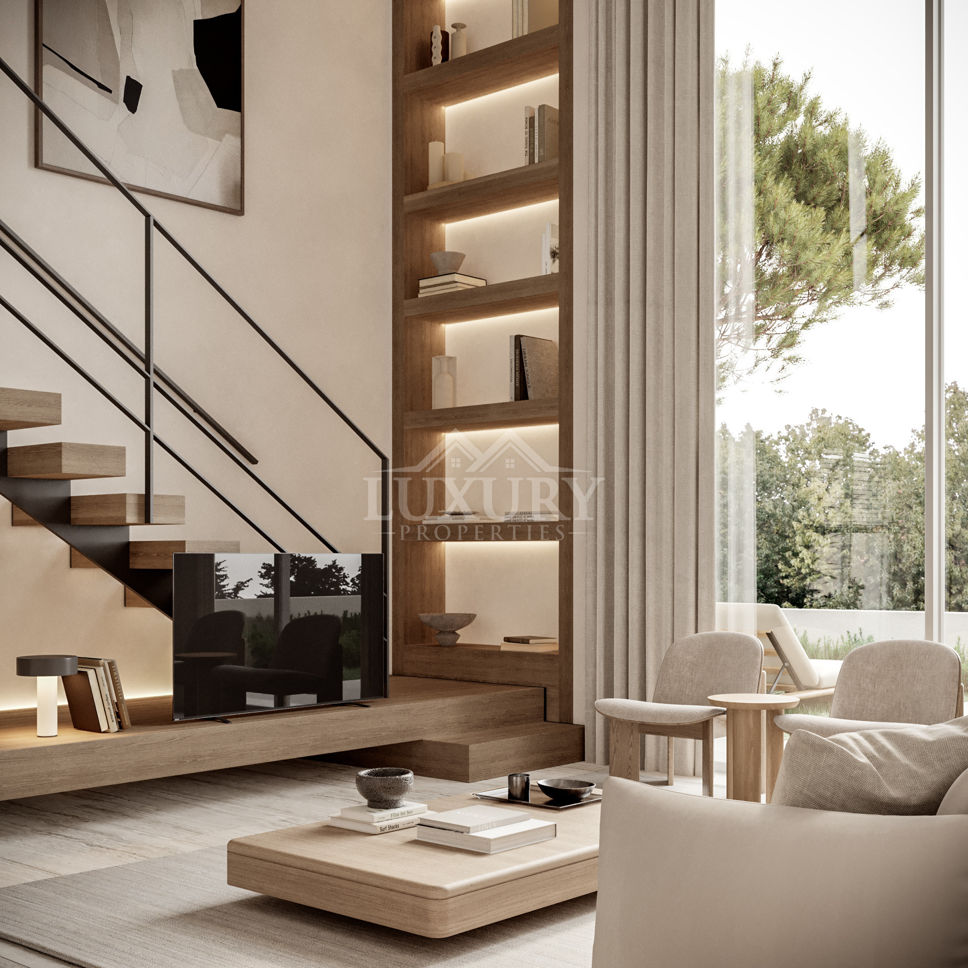 Design Style: Modern architecture with floor-to-ceiling windows, travertine finishes, large tiles, built-in sanitary ware, and concealed air-conditioning for a sleek, light-filled interior.