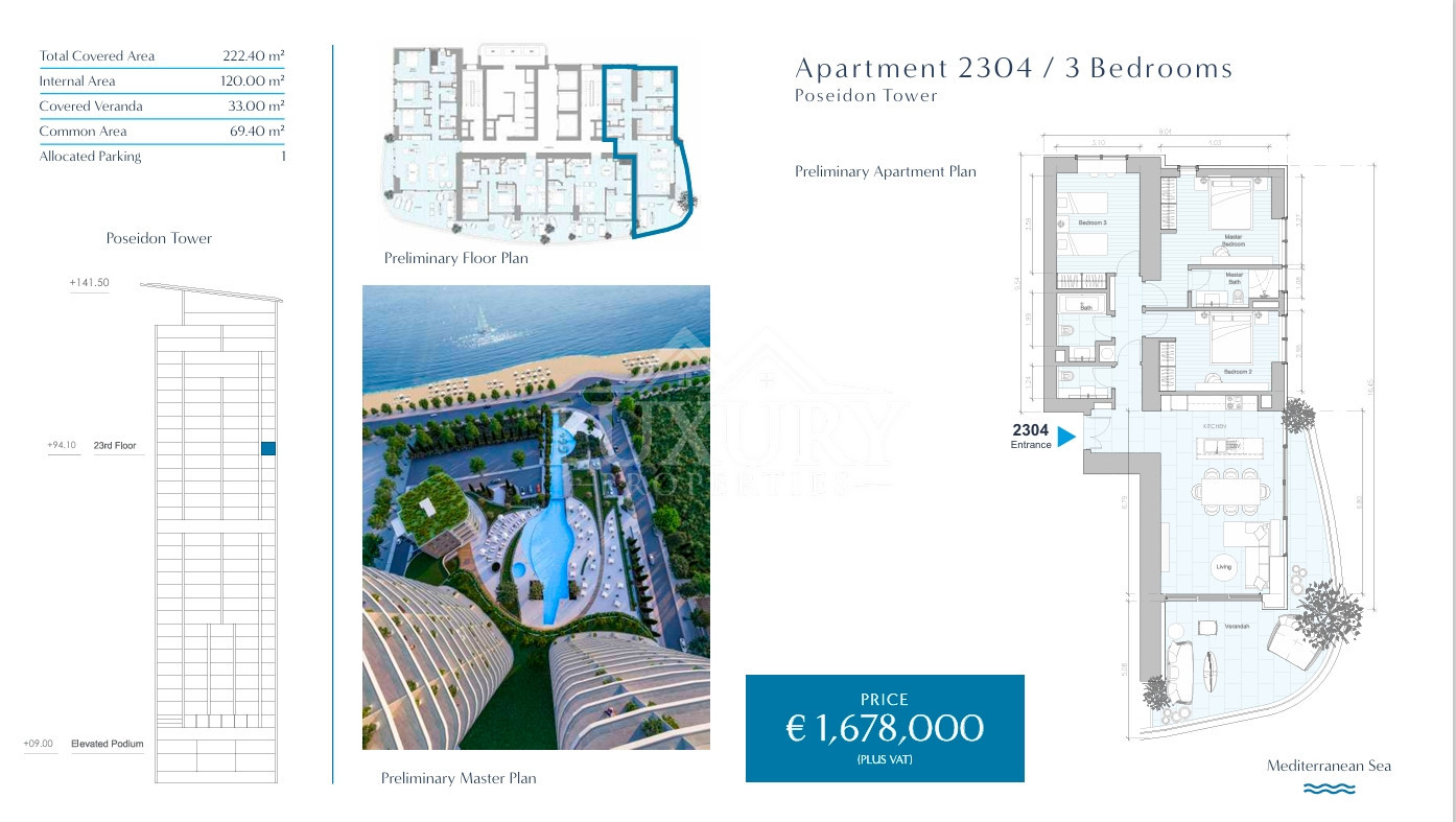 Total covered area 222.40 sq.m. of which internal area 120 sq.m, covered verandah 33 sq.m. & common areas of 69.40 sq.m. A covered car parking is also included. It provides both comfort and elegance in one of the most desirable addresses in Limassol real estate.