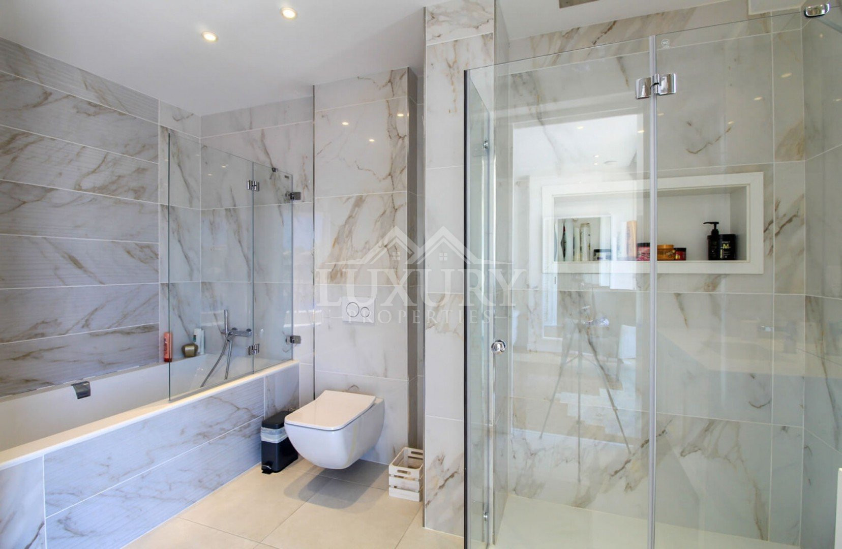 Descending the staircase to the lower level, you will find an impressively spacious master bedroom complete with an en-suite bathroom, ample fitted wardrobes, and dedicated gym equipment for private workouts. Alongside the master suite, three beautifully designed guest bedrooms each offer their own en-suite bathrooms and fitted wardrobes. A secondary kitchen and utility room are also thoughtfully positioned on this level.