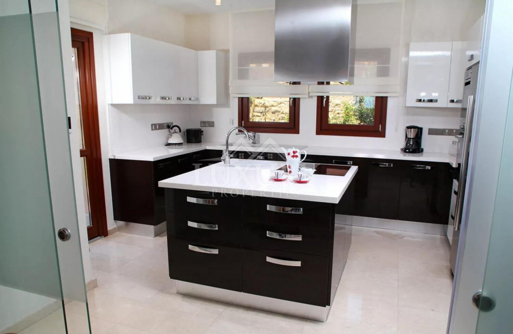 The beautifully furnished living area boasts plush armchairs and a sofa facing the graceful feature fireplace and has an adjacent dining area with a fabulous hardwood dining table and 8 opulently upholstered chairs. Sets of French doors provide magnificent views of the sea and skyline. The modern kitchen is separated by sliding glass doors features stylish high-gloss units and top quality granite worktops and splash backs. All modern conveniences are provided including a large fridge freezer, electric oven, hob and microwave and dishwasher.